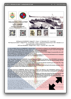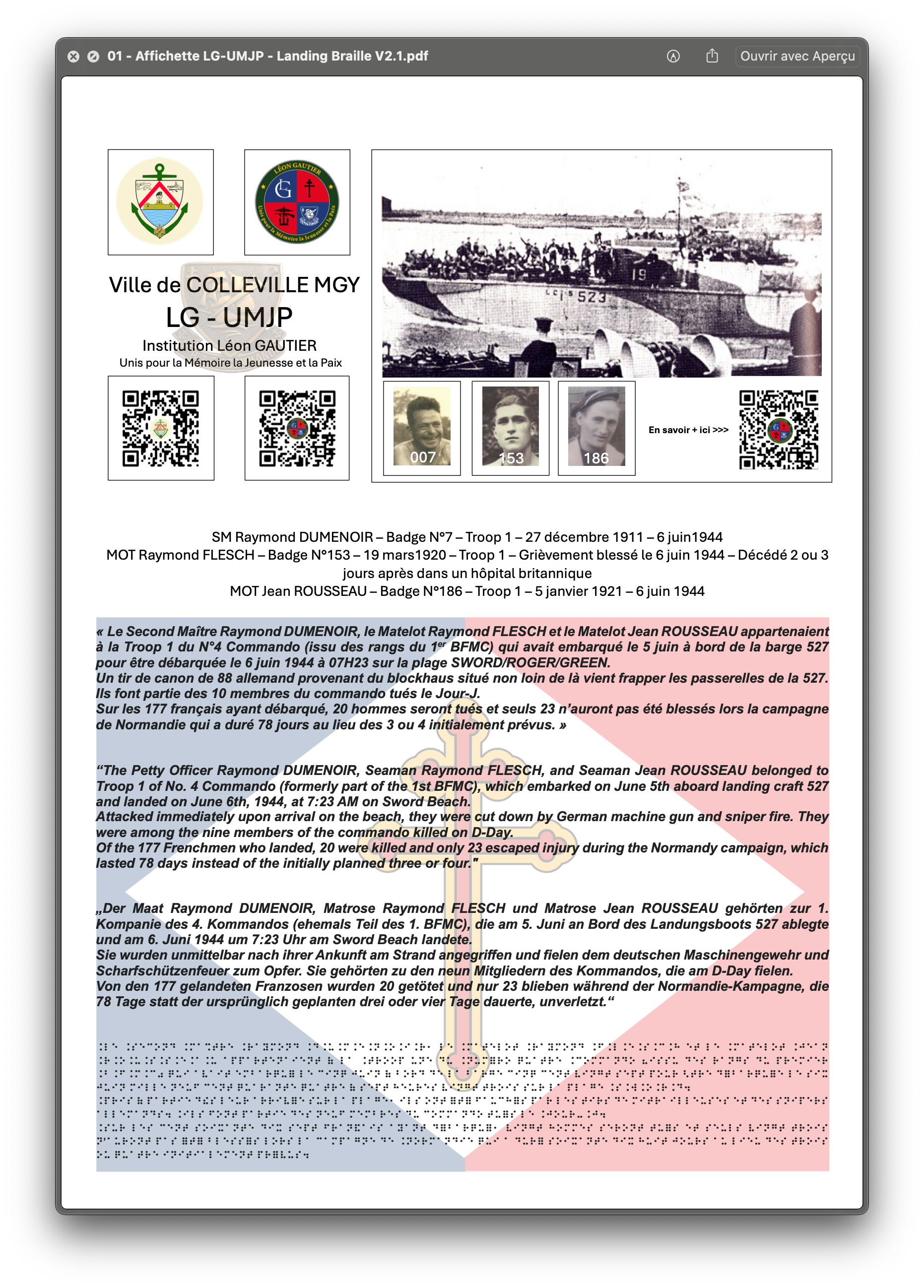 « Le Second Maître Raymond DUMENOIR, le Matelot Raymond FLESCH et le Matelot Jean ROUSSEAU appartenaient à la Troop 1 du N°4 Commando (issu des rangs du 1er BFMC) qui avait embarqué le 5 juin à bord de la barge 527 pour être débarquée le 6 juin 1944 à 07H23 sur la plage SWORD/ROGER/GREEN.